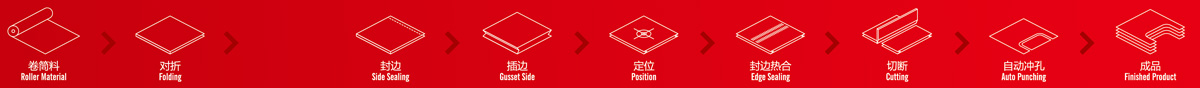 2.工序流程:卷筒料…折邊…穿繩…熱合…對折…插邊…定位…打孔…立體…熱合…切斷…沖口…收集成品。