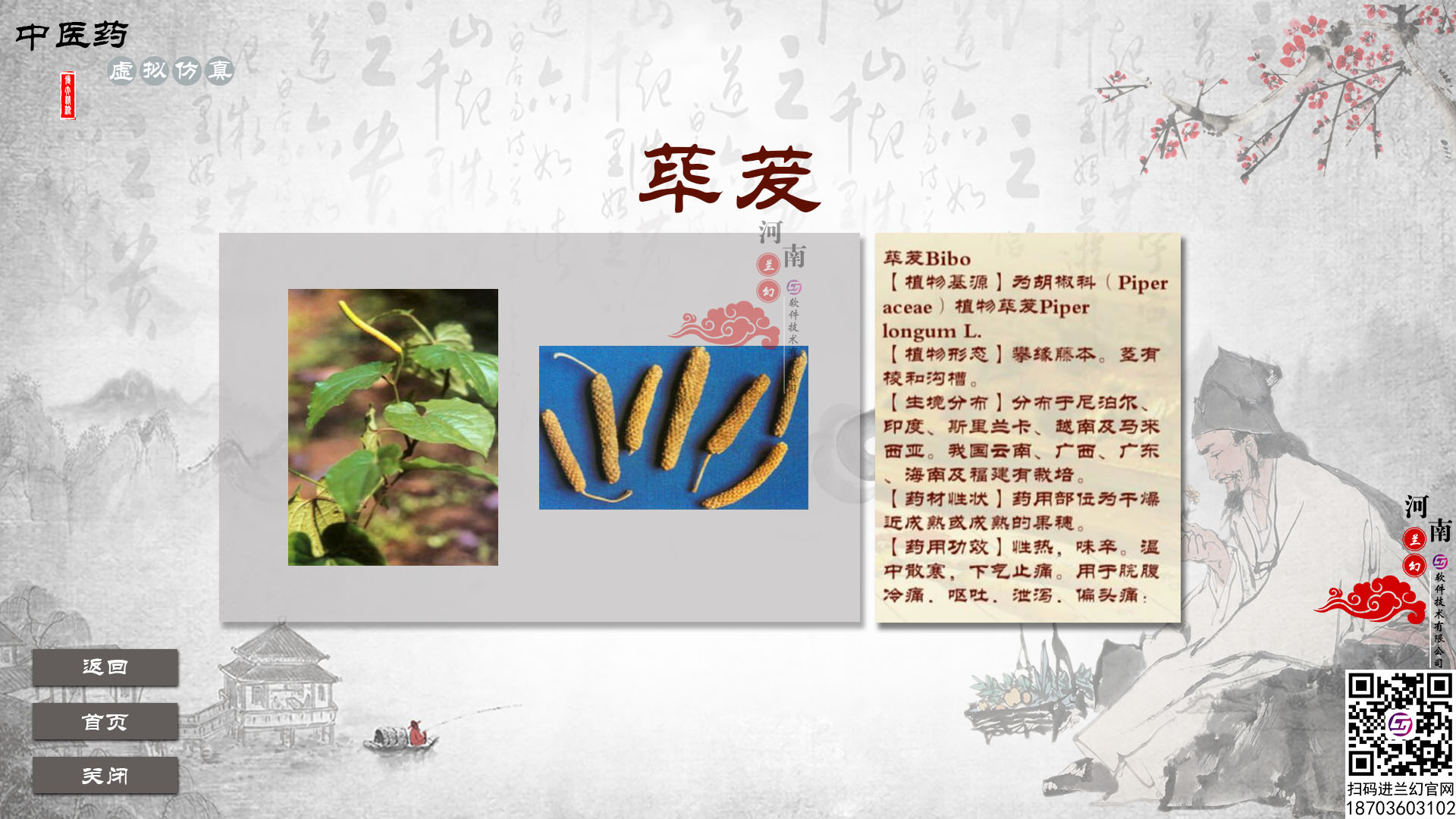中醫藥虛擬仿真系統之中藥查詢模塊以各省、自治區、直轄市為單位,將道地藥材歸納整理:藥材基源物科屬、分布、生長環境、藥用部位形狀、性狀以及其他相關信息,同時結合相應的照片、語音等教學資源,讓學員中醫藥形成體系化認知。按照:基本信息、圖譜、鑒定、種植、炮制等形成知識體系。便于查詢。