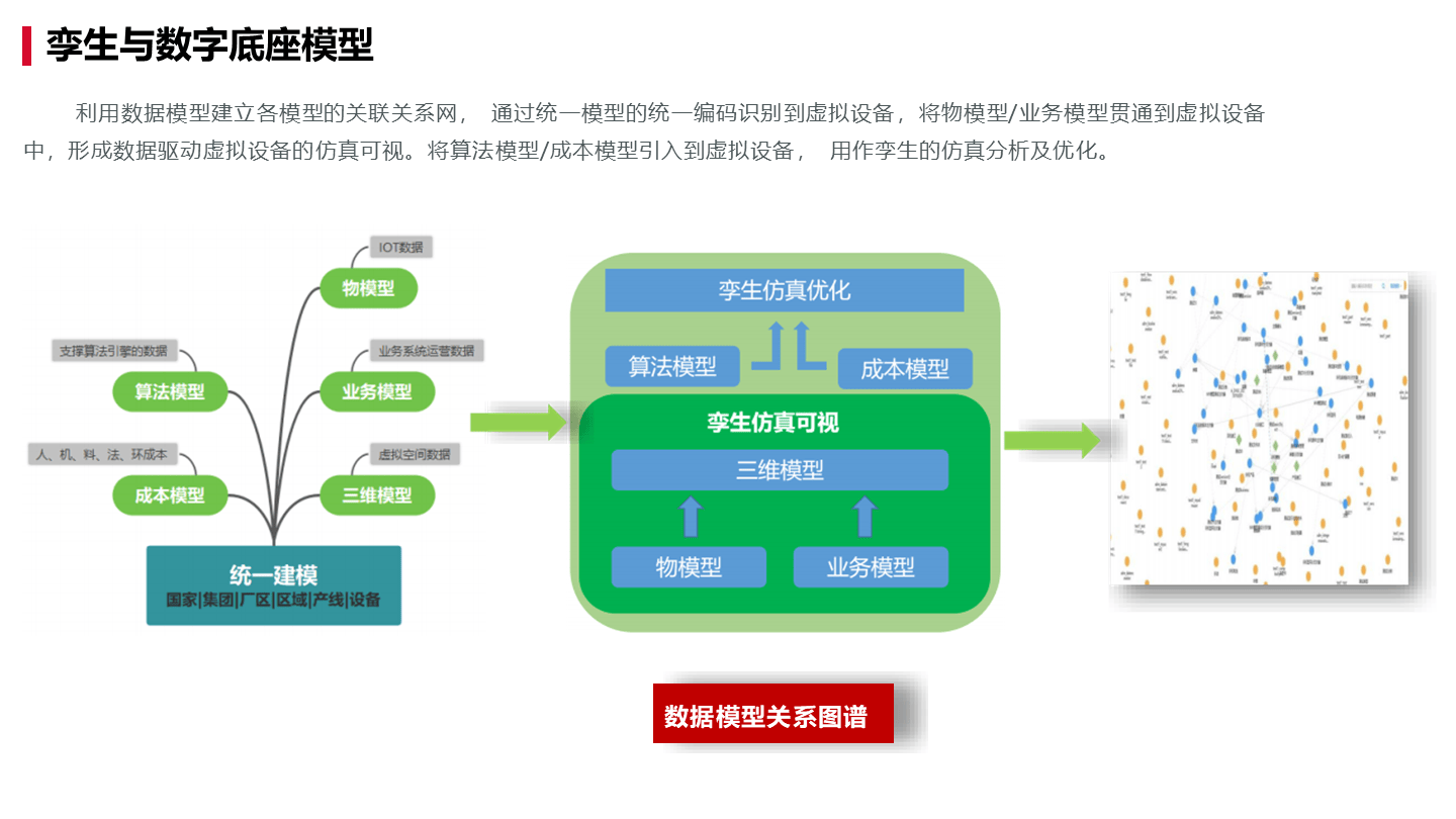 利用數(shù)據(jù)模型建立各模型的關(guān)聯(lián)關(guān)系網(wǎng),通過(guò)統(tǒng)一模型的統(tǒng)一編碼識(shí)別到虛擬設(shè)備,將物模型/業(yè)務(wù)模型貫通到虛擬設(shè)備中,形成數(shù)據(jù)驅(qū)動(dòng)虛擬設(shè)備的仿真可視。將算法模型/成本模型引入到虛擬設(shè)備,用作孿生的仿真分析及優(yōu)化。