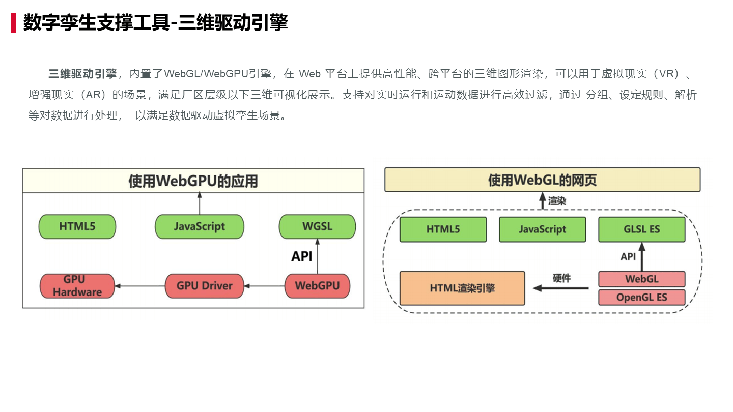 三維驅(qū)動(dòng)引擎,內(nèi)置了WebGL/WebGPU引擎,在Web平臺(tái)上提供高性能、跨平臺(tái)的三維圖形渲染,可以用于虛擬現(xiàn)實(shí)(VR)、增強(qiáng)現(xiàn)實(shí)(AR)的場(chǎng)景,滿(mǎn)足廠區(qū)層級(jí)以下三維可視化展示。支持對(duì)實(shí)時(shí)運(yùn)行和運(yùn)動(dòng)數(shù)據(jù)進(jìn)行高效過(guò)濾,通過(guò)分組、設(shè)定規(guī)則、解析等對(duì)數(shù)據(jù)進(jìn)行處理,以滿(mǎn)足數(shù)據(jù)驅(qū)動(dòng)虛擬李生場(chǎng)景。