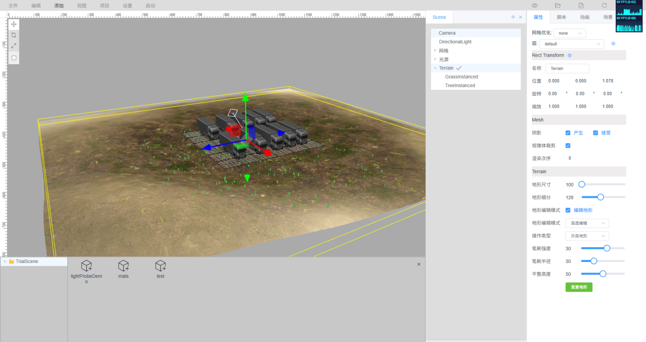 地形編輯:支持基于高程圖(如GeoTIFF)生成地形,并提供“提升/挖掘”畫(huà)筆,模擬填挖方工程。地形可融合傾斜攝影模型,實(shí)現(xiàn)真實(shí)地貌疊加。地形編輯支持刷植被、放置模型(如樹(shù)木、建筑),并自動(dòng)調(diào)整位置至地表。