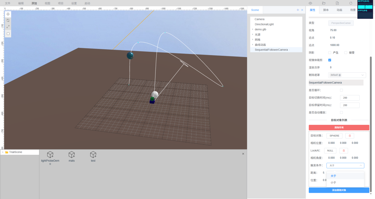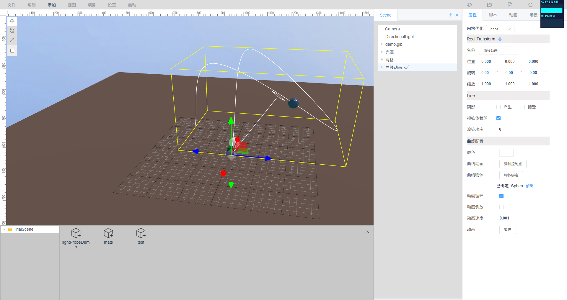 曲線動(dòng)畫(huà):用戶(hù)可以通過(guò)增加刪除控制點(diǎn)調(diào)整曲線,然后綁定動(dòng)畫(huà)物體,讓物體沿著曲線動(dòng)畫(huà),可以配置動(dòng)畫(huà)的速度,循環(huán),倒放等功能。