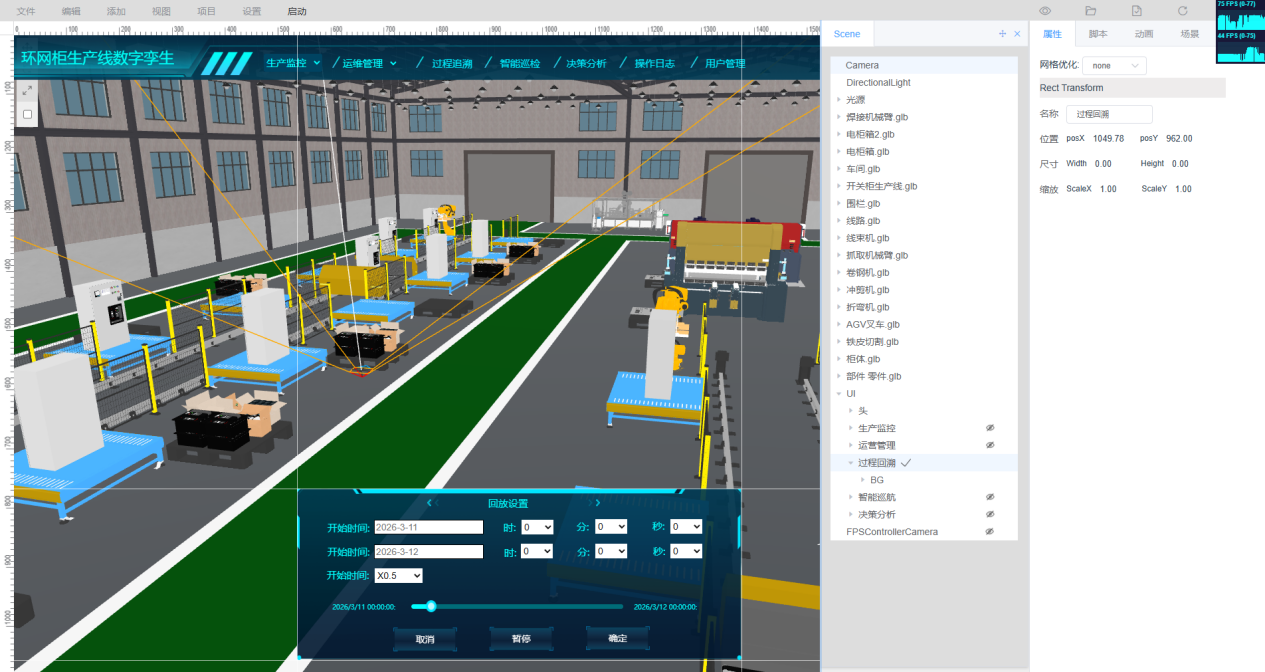 動(dòng)畫(huà)配置:為AGV小車(chē)設(shè)置路徑動(dòng)畫(huà),根據(jù)實(shí)時(shí)調(diào)度系統(tǒng)數(shù)據(jù)驅(qū)動(dòng)小車(chē)移動(dòng)。為機(jī)器人設(shè)置循環(huán)動(dòng)畫(huà),模擬焊接、搬運(yùn)動(dòng)作。當(dāng)設(shè)備故障時(shí),觸發(fā)閃爍動(dòng)畫(huà)并彈出報(bào)警窗口。