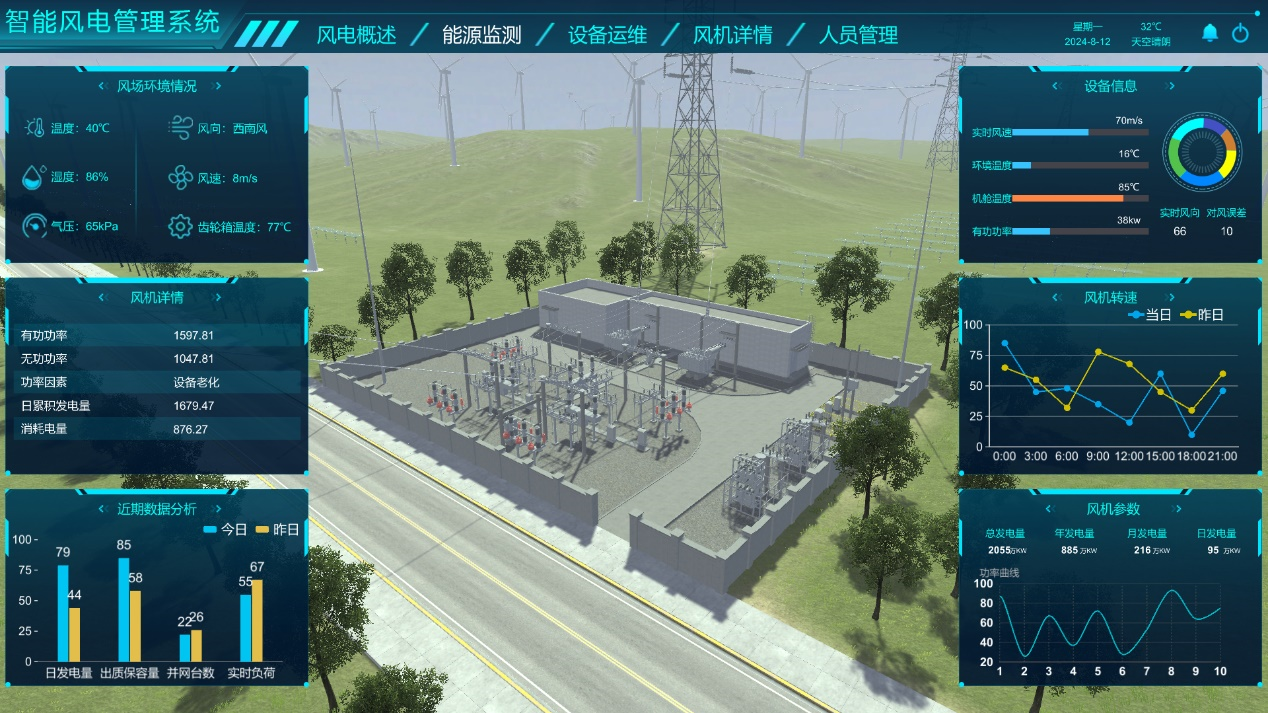 數(shù)據(jù)驅(qū)動(dòng)動(dòng)畫(huà):葉片轉(zhuǎn)速根據(jù)實(shí)時(shí)風(fēng)速動(dòng)態(tài)調(diào)整;機(jī)艙偏航根據(jù)風(fēng)向調(diào)整;功率曲線顯示在風(fēng)機(jī)旁邊的小面板上。